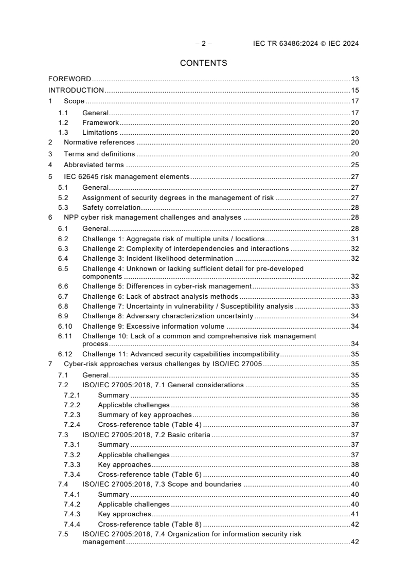 IEC TR 63486:2024 provides a cybersecurity framework for digital I&C programmable systems [2]. IEC 62645 [1] aligns strongly with the information security management system (ISMS) elements detailed within ISO/IEC 27001:2013 [2]. The ISO/IEC ISMS structure corresponds to the “I&C digital programmable system cybersecurity program” in the context (as defined in 5.2.1 of IEC 62645:2019 [1]). The scope of this document is to capture the national and international cyber-risk approaches employed to manage cybersecurity risks associated with Instrumentation and Control (I&C) and Electrical Power Systems (EPS) at a Nuclear Power Plant (NPP). This document summarizes an evaluation of cyber-risk approaches that are in use by nuclear facility operators to manage cybersecurity risks. The scope of this document generally follows the exclusions of IEC 62645 which are: - Non-malevolent actions and events such as accidental failures, human errors (except those stated above, such as impacting the performance of cybersecurity controls), and natural events. In particular, good practices for managing applications and data, including backup and restoration related to accidental failure, are out of scope. This document summarizes key insights of the international and cyber-risk approaches used at NPPs regarding the application of ISO/IEC 27005:2018 [5]. The evaluation is based on 11 challenges to cybersecurity risk management and their applicability to NPP risk management. The challenges are detailed in Clause 7. This document also relates the risk management elements of IEC 62645 and IEC 63096.