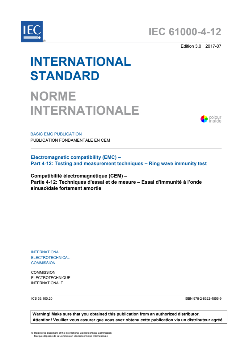 IEC 61000-4-12:2017 is an international EMC standard that specifies the ring wave immunity test used to evaluate the immunity of electrical and electronic equipment connected to low-voltage power, control and signal lines supplied by public and non-public networks. This edition (Edition 3.0, 2017) serves as a basic EMC publication (per IEC Guide 107) and defines a consistent test method, instrumentation and reporting requirements to determine how equipment behaves under ring-wave disturbances.
