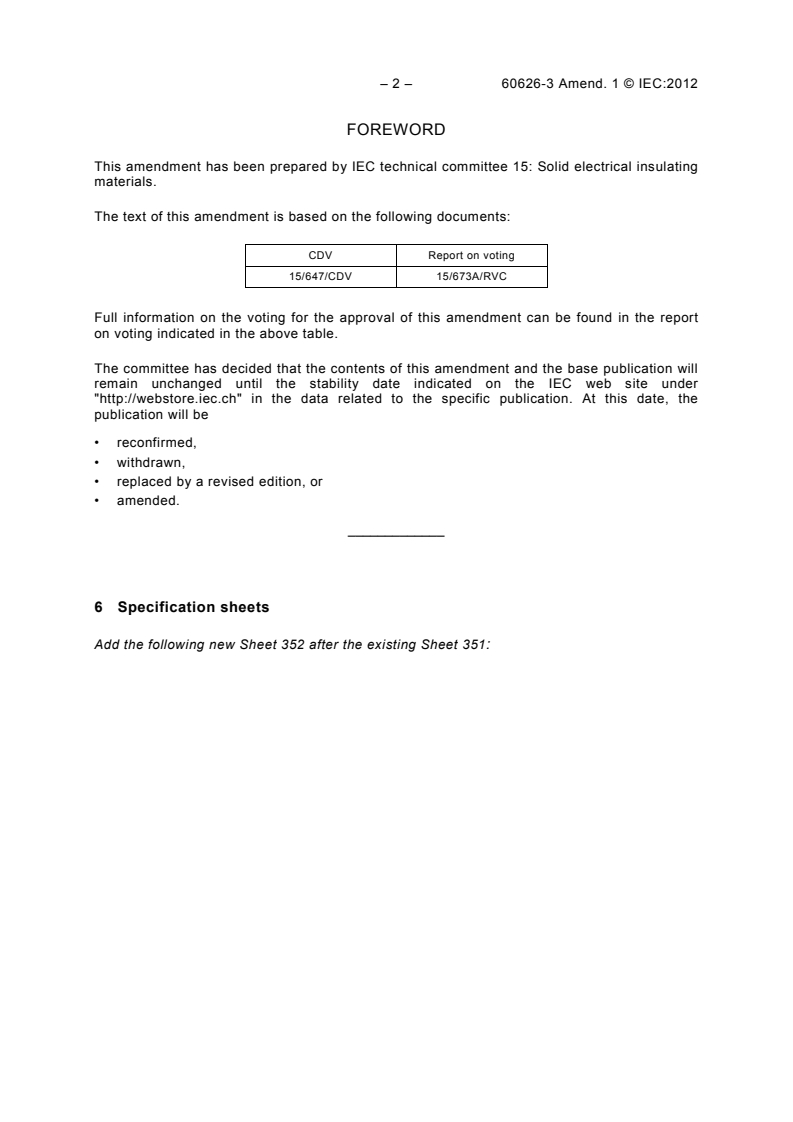 This amendment has been prepared by IEC technical committee 15: Solid electrical insulating