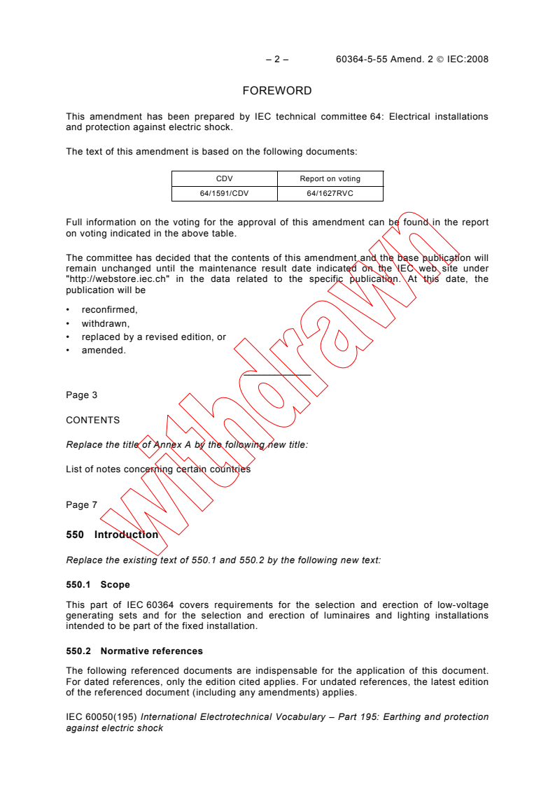 IEC 60364-5-55:2001/AMD2:2008 is an amendment to the international standard focused on the electrical installations of buildings, specifically Part 5-55: Selection and erection of electrical equipment – Other equipment. Published by the International Electrotechnical Commission (IEC), this amendment updates technical requirements for the selection and installation of low-voltage generating sets, luminaires, and lighting installations as part of fixed electrical building infrastructure.