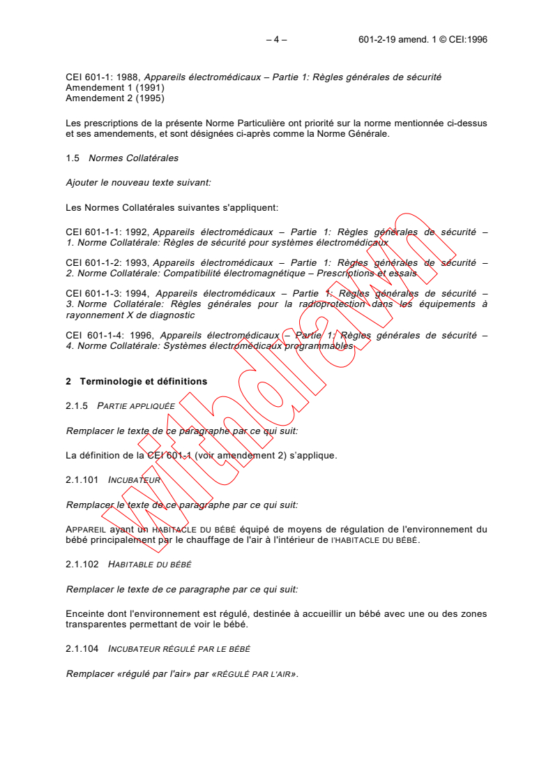Amends the standard IEC 60601-2-19 to reflect IEC 60601-1 2nd edition with its amendments 1 (1991) and 2 (1995). Contains new subclauses.