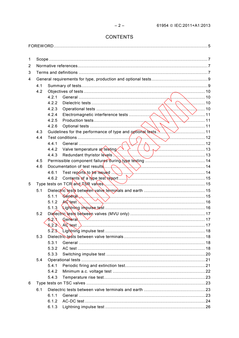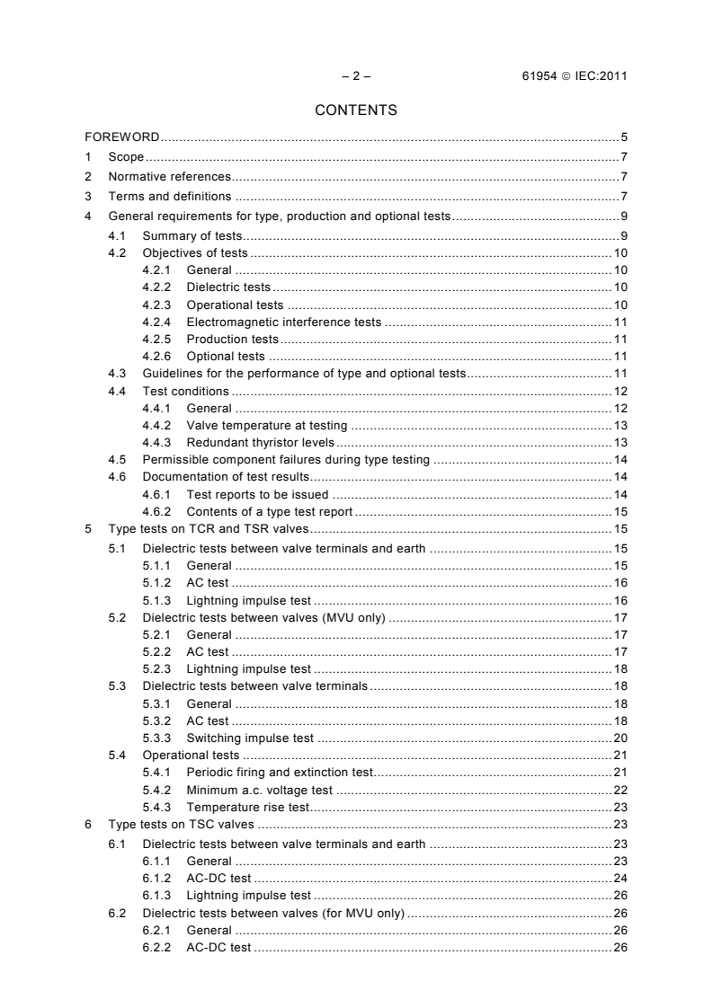 IEC 61954:2011 defines type, production and optional tests on thyristor valves used in thyristor controlled reactors (TCR), thyristor switched reactors (TSR) and thyristor switched capacitors (TSC) forming part of static VAR compensators (SVC) for power system applications. The requirements of the standard apply both to single valve units (one phase) and to multiple valve units (several phases). This edition includes the following significant technical changes with respect to the previous edition: a) Definitions of terms "thyristor level", "valve section", "valve base electronics" and "redundant thyristor levels" have been changed for clarification; b) Conditions of testing thyristor valve sections instead of a complete thyristor valve have been defined; c) The requirement has been added that if, following a type test, one thyristor level has become short-circuited, then the failed level shall be restored and this type test repeated; d) The time period of increasing the initial test voltage from 50 % to 100 % during type a.c. dielectric tests on TSC, TCR or TSR valves has been set equal to approximately 10 s; e) The duration of test voltage Uts2 during type a.c.-d.c. dielectric tests between TSC valve terminals and earth as well as the duration of test voltage Utvv2 during dielectric tests between TSC valves (for MVU only) has been changed from 30 min to 3 h; f) The reference on the number of pulses per minute of the periodic partial discharge recorded during a.c.-d.c. dielectric tests on TSC valves and exceeding the permissible level has been deleted.