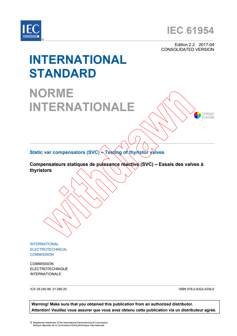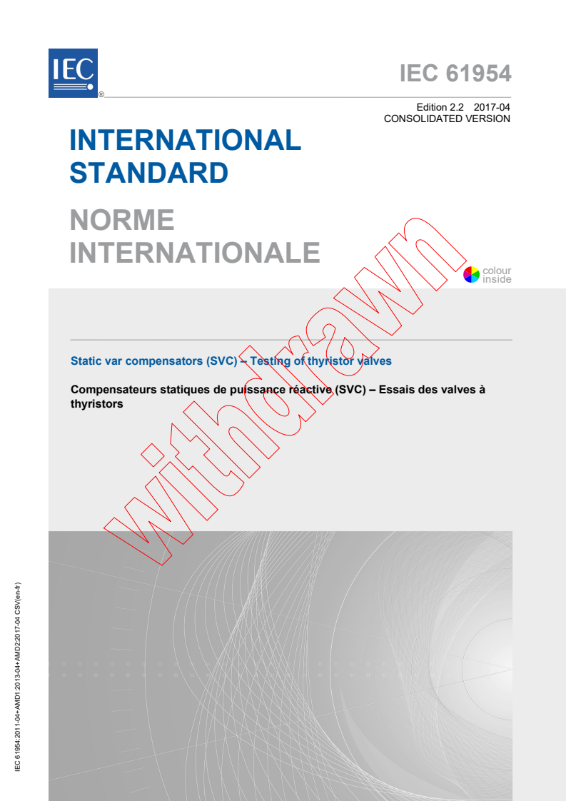 IEC 61954:2011+AMD1:2013+AMD2:2017 CSV - Static var compensators (SVC) - Testing of thyristor valves Released:4/12/2017