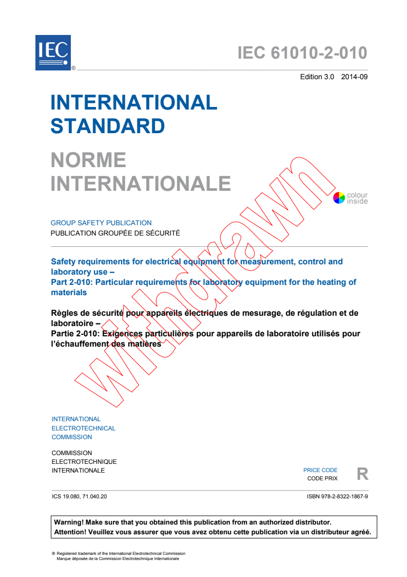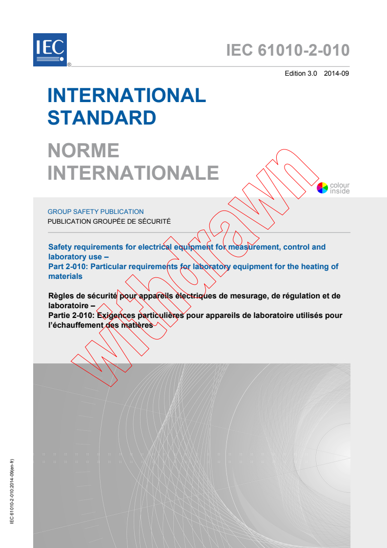 IEC 61010-2-010:2014 - Safety requirements for electrical equipment for measurement, control and laboratory use - Part 2-010: Particular requirements for laboratory equipment for the heating of materials Released:9/25/2014