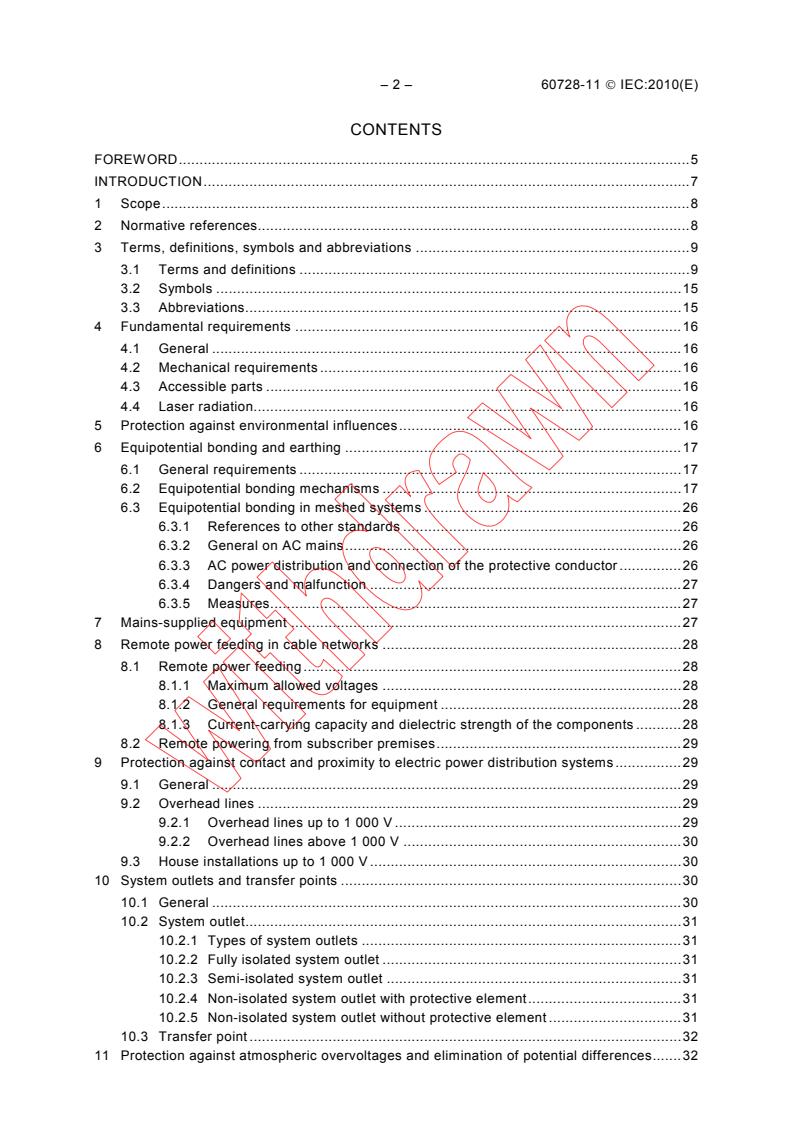 IEC 60728-11:2010(E) deals with the safety requirements applicable to fixed sited systems and equipment. As far as applicable, it is also valid for mobile and temporarily installed systems, for example, caravans. Additional requirements may be applied. It is intended to provide specifically for the safety of the system, personnel working on it, subscribers and subscriber equipment. It deals only with safety aspects and is not intended to define a standard for the protection of the equipment used in the system. This third edition cancels and replaces the second edition published in 2005. This edition constitutes a technical revision and includes the following significant technical changes with respect to the previous edition: The list of "differences in some countries" was transferred from the "Foreword" to informative Annex D. Some new terms and definitions were added. All Figures were reworked among other things concerning equipotential bonding and earthing details and were incorporated in the text at the appropriate places. Clause 11 "Protection against atmospheric overvoltages and elimination of potential differences" was completely reworked and re-structured taking into account among other things the provisions and requirements of the IEC 62305 series on "Lightning protection". New informative Annex A on "Earth loop impedance" was added. New informative Annex C on "Examples of calculation of risk due to lightning" was added. Former Annex B on "Special conditions using IT power line networks" was re-worded and incorporated in Annex D as "Difference in Norway".