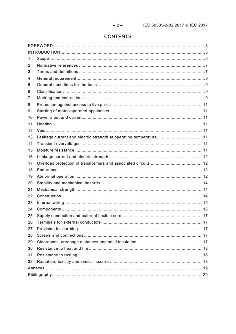 This publication has been drafted in accordance with the ISO/IEC Directives, Part 2. This part 2-82 is to be used in conjunction with the latest edition of IEC 60335-1 and its amendments. It was established on the basis of IEC 60335-1:2010, its Amendment 1:2013 and its Amendment 2:2016. The attention of National Committees is drawn to the fact that equipment manufacturers and testing organizations may need a transitional period following publication of a new, amended or revised IEC publication in which to make products in accordance with the new requirements and to equip themselves for conducting new or revised tests. It is the recommendation of the committee that the content of this publication be adopted for implementation nationally not earlier than 12 months or later than 36 months from the date of publication.