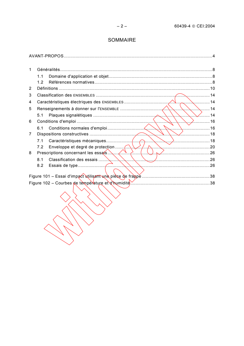 S'applique aux ENSEMBLES de série (ES) destinés à équiper des chantiers, c'est-à-dire des lieux de travail temporaires qui ne sont pas normalement accessibles au public et où sont exécutés des travaux de construction, d'équipement, de réparation, de modification ou de démolition d'immeubles (bâtiments) ou d'ouvrage d'art (travaux publics) ou encore des travaux de terrassement ou tout autres travaux analogues. Ces ENSEMBLES peuvent être de type transportable (semi-fixe) ou mobile. La présente norme ne s'applique pas aux ENSEMBLES destinés à être utilisés dans les locaux de service des chantiers (bureaux, vestiaires, salles de réunion, cantines, restaurants, dortoirs, locaux sanitaires, etc.). Les valeurs nominales des tensions primaire et secondaire des appareils de transformation incorporés dans les ensembles de chantier (EC) doivent être dans les limites fixées dans la CEI 60439-1. Les exigences de protection électrique fournies par l'équipement fabriqué selon la présente norme internationale doivent satisfaire aux exigences données dans la CEI 60364-7-704. NOTE: La présente norme peut être utilisée comme un guide pour les ENSEMBLES dérivés de série (EDS), fabriqués selon accord entre constructeur et utilisateur et prenant en compte la nature du réseau d'alimentation et/ou de distribution et les exigences de l'installation concernée. Les modifications majeures suivantes par rapport à la première édition (y compris les amendements 1 et 2) ont été incorporées: - introduction de la définition pour "courant assigné de l'EC"; - remplacement de la classification basée sur le courant assigné de l'EC par une classification basée sur la fonction telle qu'attribuée par le constructeur; - prescriptions modifiées pour la protection des socles de prises de courant avec référence à des prescriptions plus compréhensibles de la CEI 60364-7-704; - introduction de prescriptions communes pour tous les types d'EC.