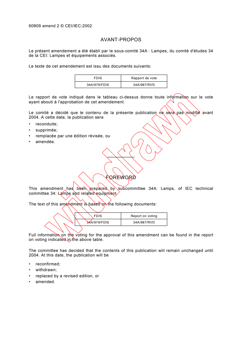 IEC 60809:1995/AMD2:2002 is the second amendment to the international standard IEC 60809, which specifies dimensional, electrical, and luminous requirements for filament lamps intended for road vehicles. This amendment updates the original 1995 edition, including enhanced test methods, revised data sheets, and additional annexes to cover a wider range of lamp types used in automotive lighting. The standard is published by the International Electrotechnical Commission (IEC), ensuring global harmonization of technical specifications for replaceable filament lamps used in vehicle headlamps, fog lamps, and signaling lamps.