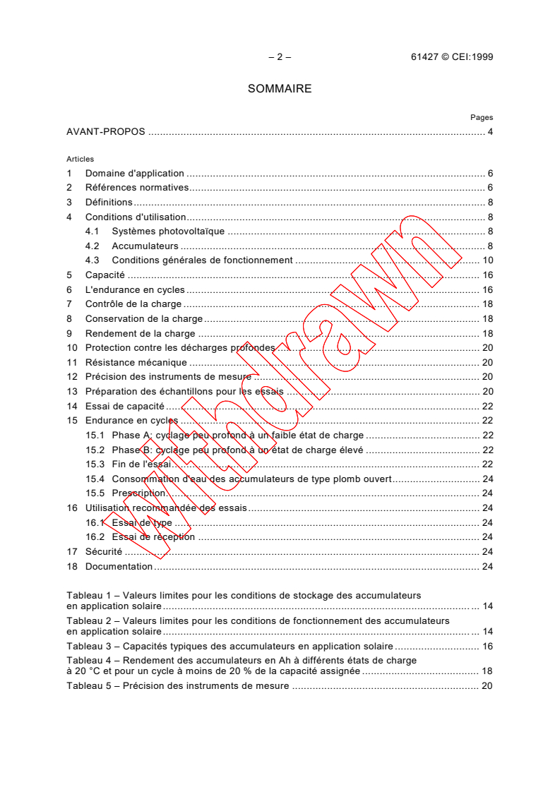 IEC 61427:1999 is an international standard developed by the International Electrotechnical Commission (IEC) that specifies general requirements and methods of test for secondary cells and batteries used in solar photovoltaic (PV) energy systems. This standard focuses on the performance verification of batteries integral to PV systems, ensuring reliability, safety, and efficiency in solar energy storage applications. It provides a comprehensive framework covering operational conditions, testing procedures, and performance metrics but does not delve into specific battery sizing, charging methods, or the overall photovoltaic system design.