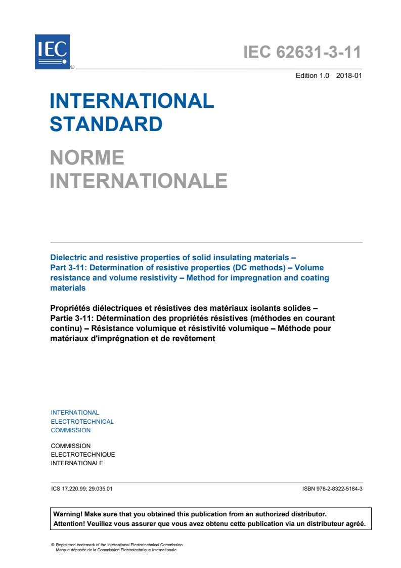 IEC 62631-3-11:2018 - Dielectric and resistive properties of solid insulating materials - Part 3-11: Determination of resistive properties (DC Methods) - Volume resistance and volume resistivity - Method for impregnation and coating materials Released:1/10/2018