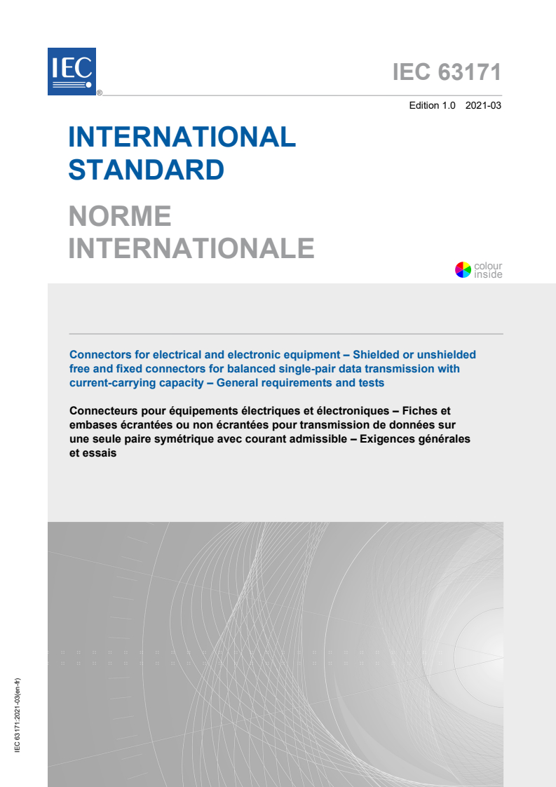 IEC 63171:2021 is an international standard published by the International Electrotechnical Commission (IEC), focusing on connectors used in electrical and electronic equipment. Specifically, it addresses shielded or unshielded free and fixed connectors designed for balanced single-pair data transmission that also have current-carrying capabilities. The standard establishes general requirements and test methods ensuring these connectors meet essential mechanical, electrical, transmission, and environmental performance criteria.