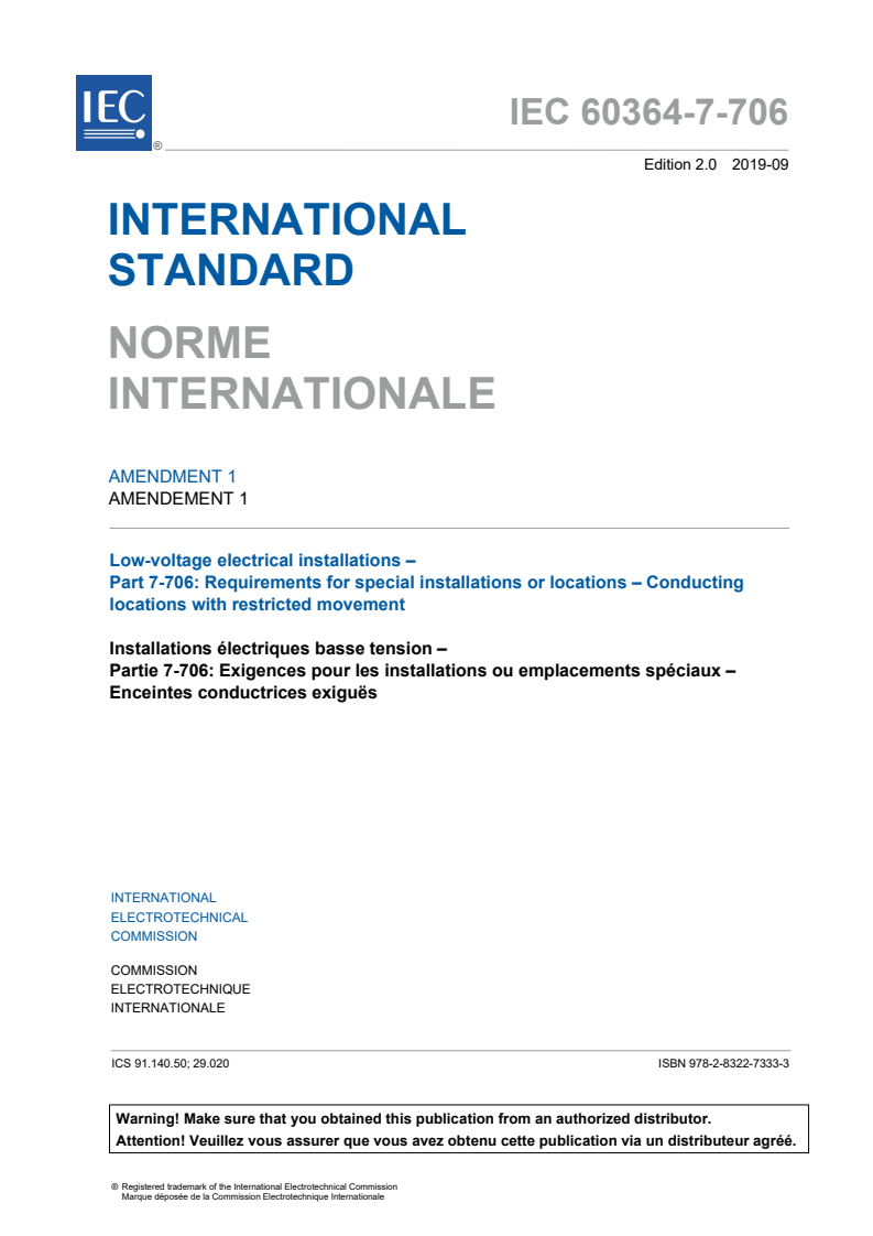 IEC 60364-7-706:2005/AMD1:2019 - Amendment 1 - Low-voltage electrical installations - Part 7-706: Requirements for special installations or locations - Conducting locations with restricted movement Released:9/26/2019