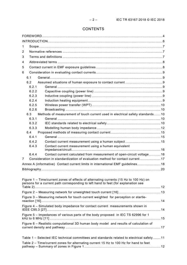 IEC TR 63167:2018 is a technical report published by the International Electrotechnical Commission (IEC). Its full title is "Assessment of contact current related to human exposure to electric, magnetic and electromagnetic fields". This standard covers: IEC/TR 62905:2018(E) is a Technical Report. Provides general information on the assessment of contact current related to human exposure to electric, magnetic and electromagnetic fields. The contact currents in this context occur when a human body comes into contact with a not electrified conductive object exposed to an electric and/or magnetic field at a different electric potential owing to electric and/or magnetic induction to the object. This is distinguished from the issue of electrical safety where contact with live parts of a conductive object is dealt with. In reference to the international EMF guidelines, the frequency range of contact current covered in this document is direct current to 110 MHz, and only steady-state (continuous) contact currents are covered. Transient contact currents (spark discharges) which may occur immediately before the contact with the object are not covered. Keywords: Human Exposure Electric Fields, Magnetic Fields, Electromagnetic Fields