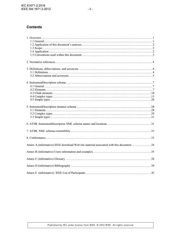 IEC 61671-2:2016 / IEEE Std 1671.2-2012 specifies an exchange format, based on Extensible Markup Language (XML), for describing test and measurement instruments used in automatic test systems (ATS). The standard defines both the static model description (InstrumentDescription) and the concrete instrument instance information (InstrumentInstance), expressed as XML schemas. It is published as an IEC/IEEE dual-logo standard and forms part of the Automatic Test Markup Language (ATML) family.