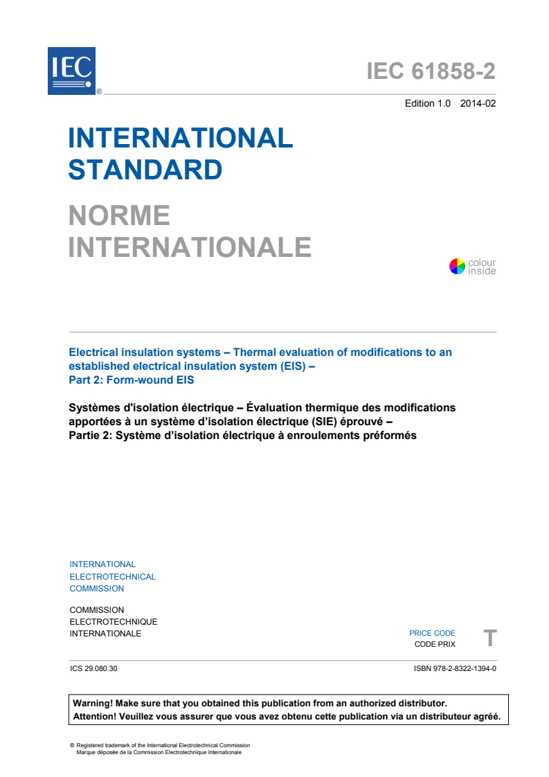 IEC 61858-2:2014 - Electrical insulation systems - Thermal evaluation of modifications to an established electrical insulation system (EIS) - Part 2: Form-wound EIS Released:2/12/2014