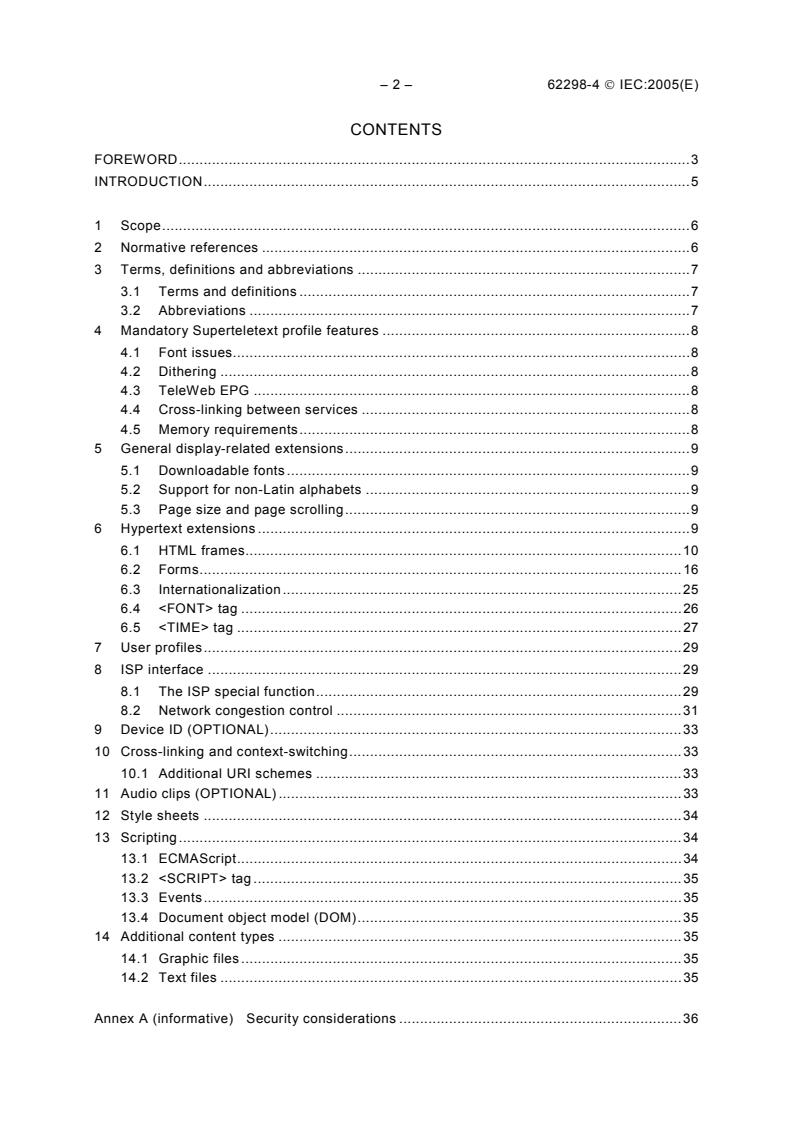 IEC 62298-4:2005 - TeleWeb application, Part 4: Hyperteletext profile - specifies the TeleWeb Hyperteletext profile that enables Web-style text and graphics to be delivered and displayed on TV decoders. The standard defines the multimedia data file formats, presentation-layer behavior (TeleWeb HTML and scripting), graphical requirements (fonts, frames, forms) and content attributes for TeleWeb services. It is backwards compatible with IEC 62298-3 (Superteletext profile) and extends that profile with features such as scripting, style sheets, frames and forms to support richer interactive TV content.