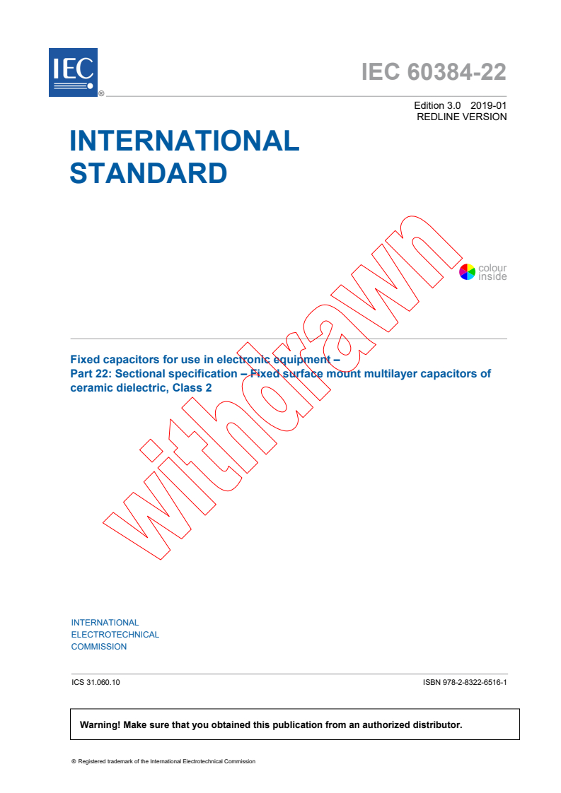 IEC 60384-22:2019 - Fixed capacitors for use in electronic equipment - Part 22: Sectional specification - Fixed surface mount multilayer capacitors of ceramic dielectric, Class 2 Released:1/29/2019