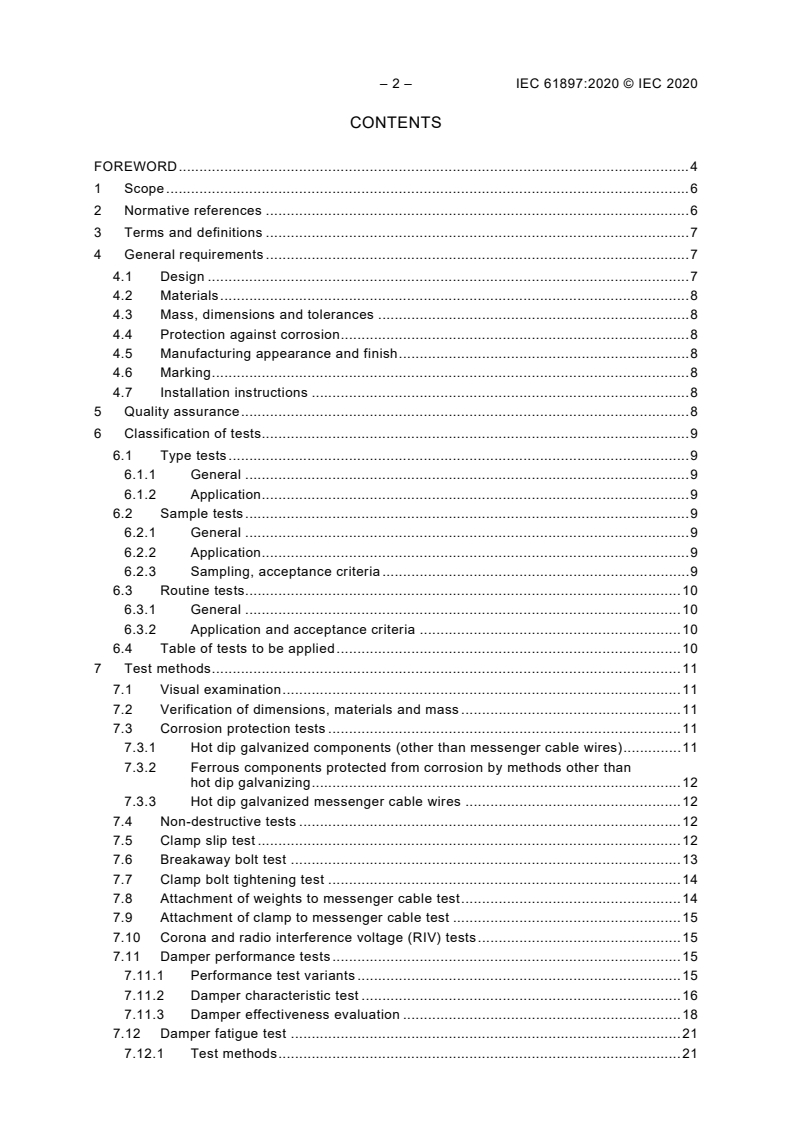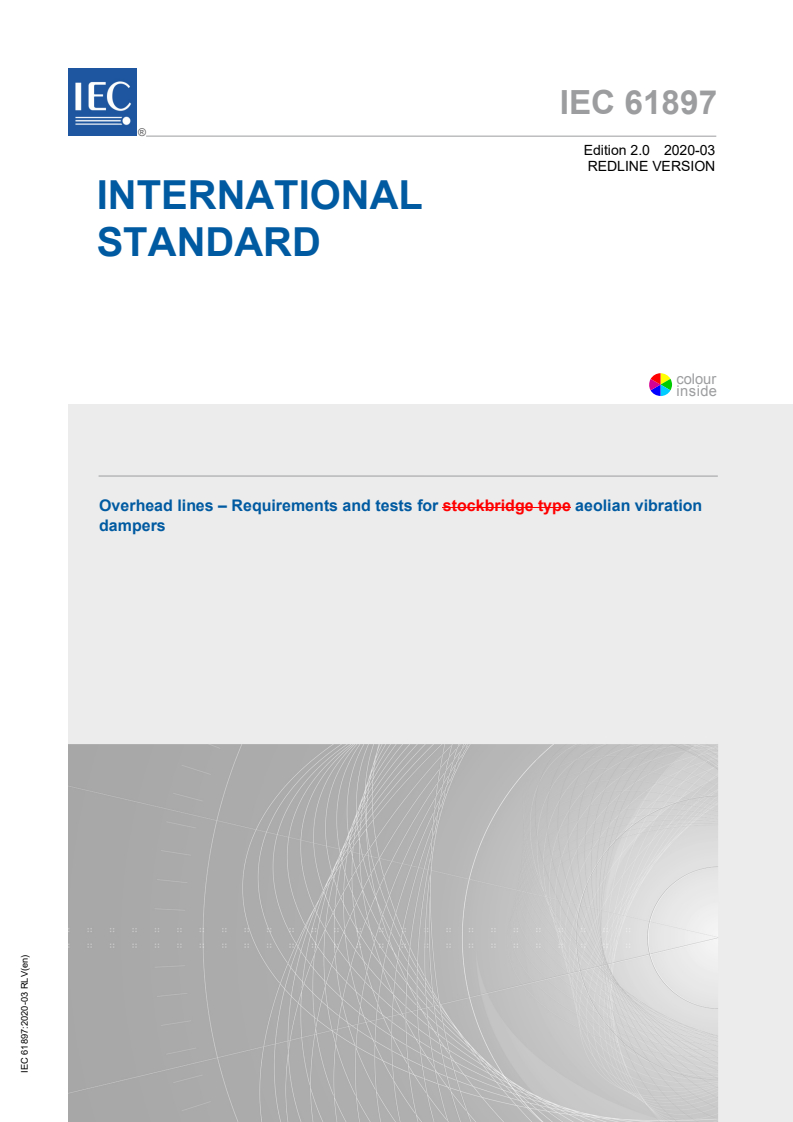 Keywords: IEC 61897:2020, Overhead Lines, Aeolian Vibration Dampers, Stockbridge dampers, spiral dampers, elastomeric dampers, high temperature conductors, damper effectiveness, clamp slip tests, breakaway bolt test.