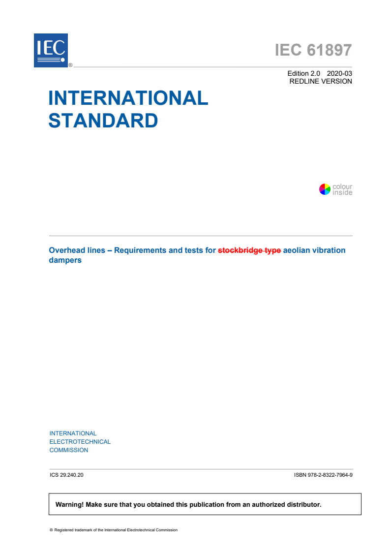 IEC 61897:2020 RLV - Overhead lines - Requirements and tests for Aeolian vibration dampers Released:3/3/2020