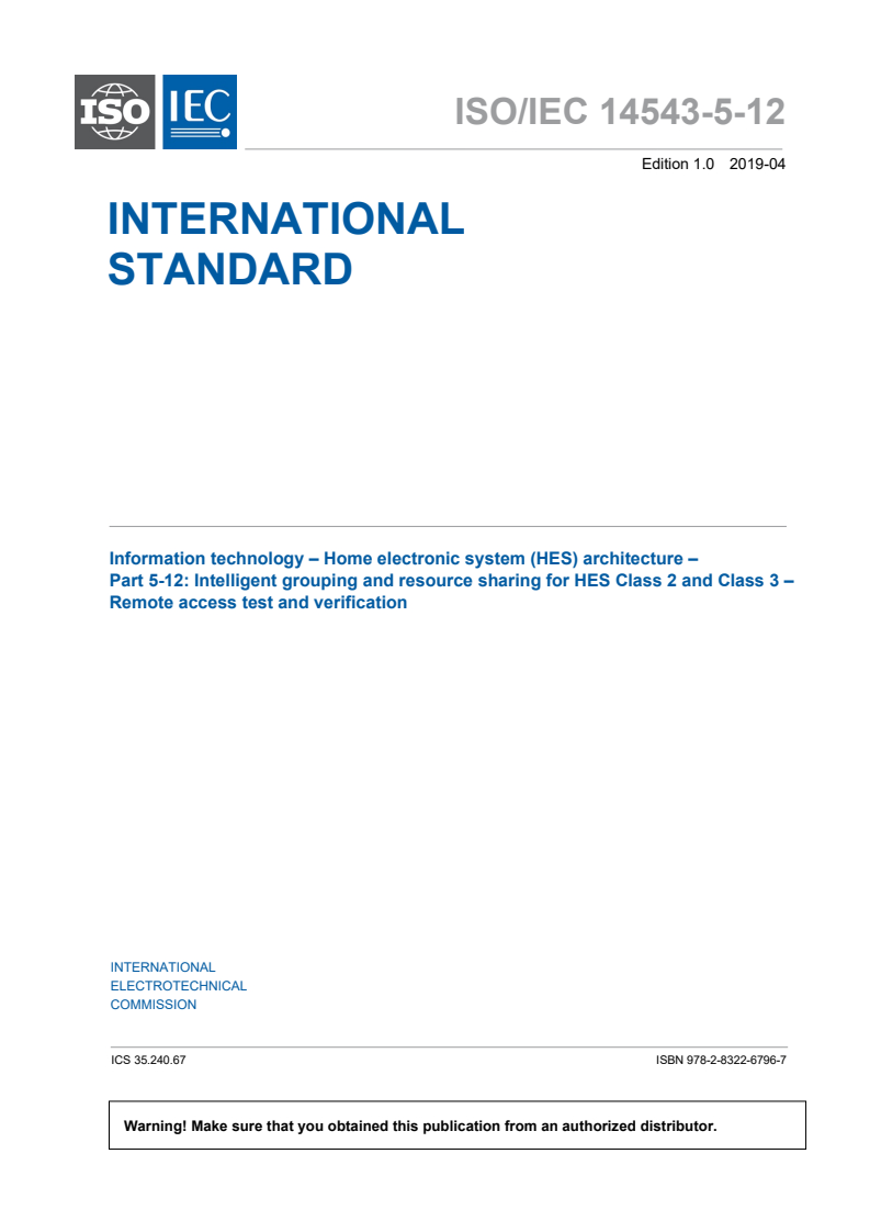 ISO/IEC 14543-5-12:2019 is a standard published by the International Electrotechnical Commission (IEC). Its full title is "Information technology - Home electronic system (HES) architecture - Part 5-12: Intelligent grouping and resource sharing for HES Class 2 and Class 3 - Remote access test and verification". This standard covers: ISO/IEC 14543-5-12:2019(E) specifies the test and verification methods for an intelligent grouping and resource sharing (IGRS) remote access (RA) user or device, defines the structure of a user and device testing system for IGRS remote access, describes and specifies the exchange process between a user or device-under-test with a standard IGRS RA service platform (IRSP), and describes and specifies the rules to have validating messages. This document is applicable to the test and verification of an IGRS RA device or user.
