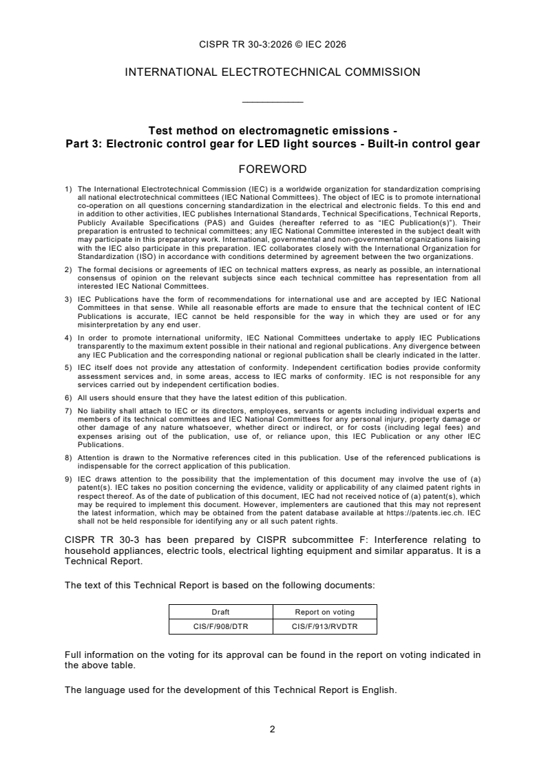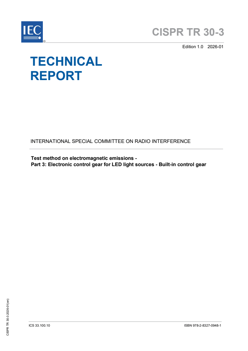 CISPR TR 30-3:2026 is a technical report published by the International Electrotechnical Commission (IEC) that provides a standardized test method for assessing electromagnetic emissions from electronic control gear (ECG) specifically designed for LED light sources, focusing on built-in control gear. The document covers the construction and parameters of a reference luminaire, the measurement procedure, and test conditions to evaluate the radio disturbance characteristics of these ECGs. This standard targets ECGs intended for installation within luminaires that meet safety protection class I and have a linear form factor with a rated output power below 360 W.