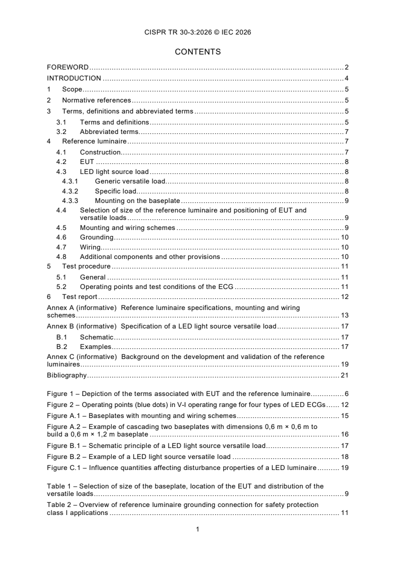 CISPR TR 30-3:2026 which is a Technical report , details the construction and parameters of a reference luminaire, a measurement procedure and conditions for assessment of the radio disturbance characteristics of electronic control gears (ECG) for LED light sources applied inside. This document is limited to ECGs (also called “control gears”) as well as end-user replaceable ECGs with the following characteristics or applications: - applied in luminaires with safety protection class I; NOTE This means that the mains interface of the ECG itself can have either a protective earth (PE) or a functional earth (FE) terminal. For details, see 4.6 and Table 2. linear form factor, i.e. fits within the space provision defined in Figure A.1 a). - ECGs with a rated output power less than 360 W. Excluded from the scope of this document are - ECGs for applications that are excluded in CISPR 15:2018 and CISPR 15:2018/AMD1:2024, and - control gear with only L, N input terminals (without PE terminal).