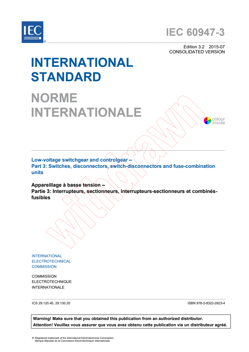 IEC 60947-3:2008+AMD1:2012+AMD2:2015 CSV - Low-voltage switchgear and controlgear - Part 3: Switches, disconnectors, switch-disconnectors and fuse-combination units Released:7/27/2015