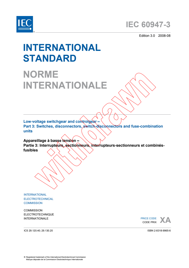 IEC 60947-3:2008 - Low-voltage switchgear and controlgear - Part 3: Switches, disconnectors, switch-disconnectors and fuse-combination units Released:8/28/2008