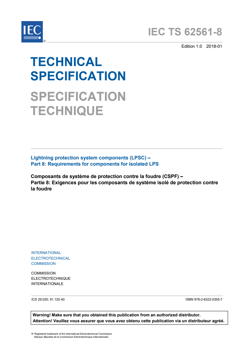 IEC TS 62561-8:2018 - Lightning protection system components (LPSC) - Part 8: Requirements for components for isolated LPS Released:1/9/2018