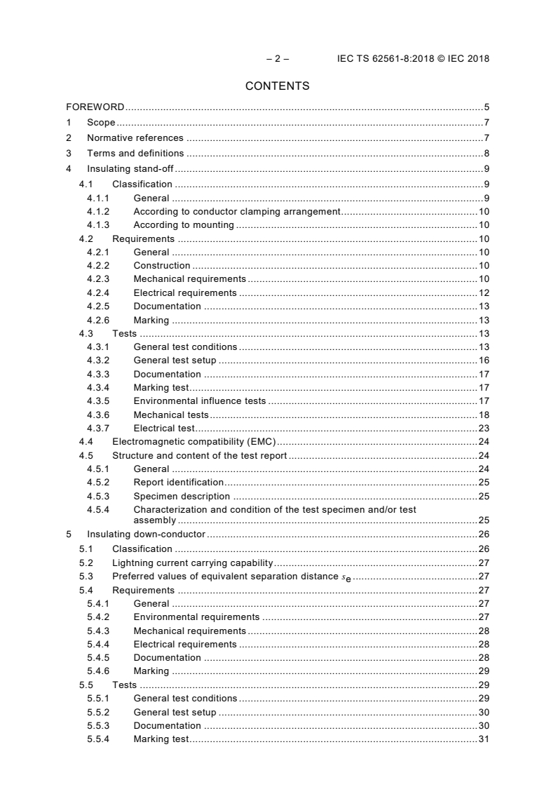 IEC/TS 62561-8:2018 specifies the requirements and tests for insulating stand-offs, used in conjunction with an air-termination system and down-conductors with the aim of maintaining the proper separation distance, and the requirements and tests for insulating down‑conductors, including their specific fasteners, able to reduce the separation distance.