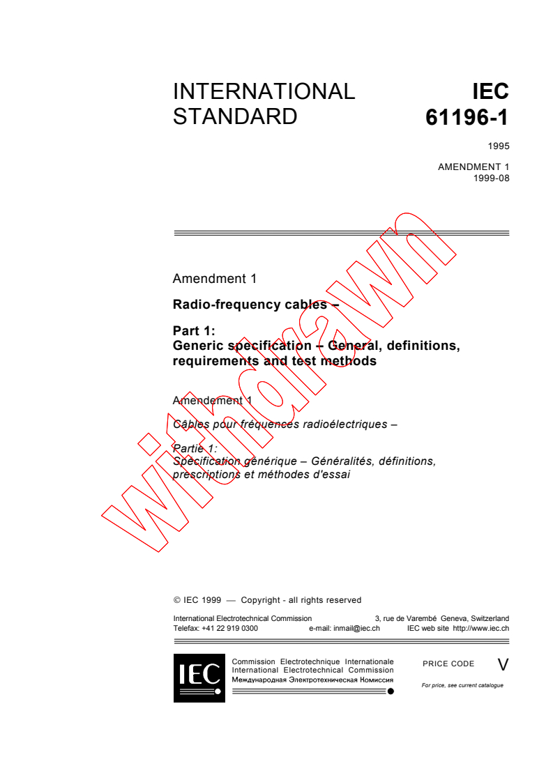 IEC 61196-1:1995/AMD1:1999 is Amendment 1 (1999) to the IEC generic specification for radio‑frequency cables (Part 1: general, definitions, requirements and test methods). It clarifies and corrects mathematical expressions, test procedures, specimen preparation, marking requirements and measurement expressions used in the original 1995 Part 1. The amendment was prepared by IEC TC 46/SC 46A (coaxial cables) and updates formulas, tolerances and references to related environmental test standards.