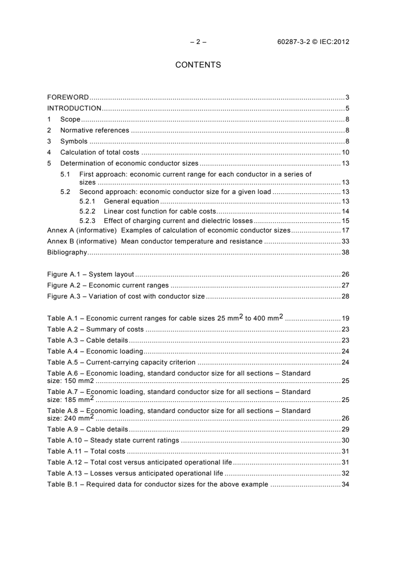 IEC 60287-3-2:2012 sets out a method for the selection of a cable size taking into account the initial investments and the future costs of energy losses during the anticipated operational life of the cable. Matters such as maintenance, energy losses in forced cooling systems and time of day energy costs have not been included in this standard. Two examples of the application of the method to hypothetical supply systems are given in Annex A.