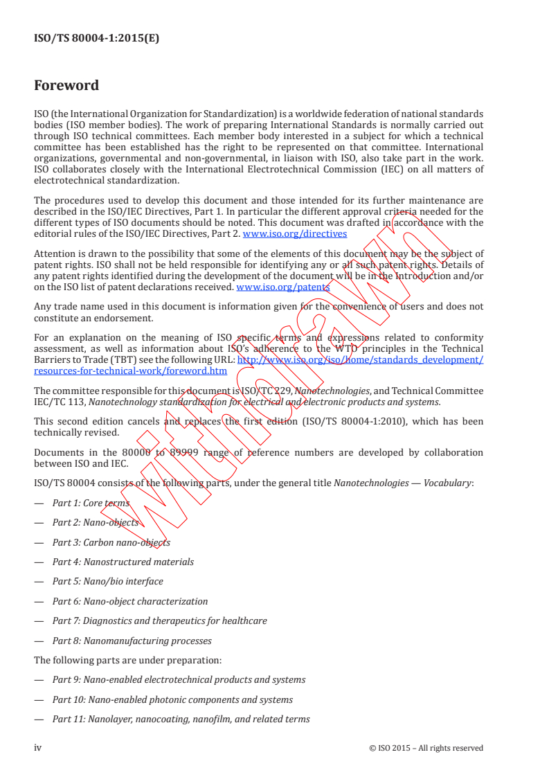 ISO TS 80004-1:2015 is a technical specification published by the International Electrotechnical Commission (IEC). Its full title is "Nanotechnologies -- Vocabulary -- Part 1: Core terms". This standard covers: ISO TS 80004-1:2015 lists terms and definitions related to core terms in the field of nanotechnologies. It is intended to facilitate communications between organizations and individuals in industry and those who interact with them.