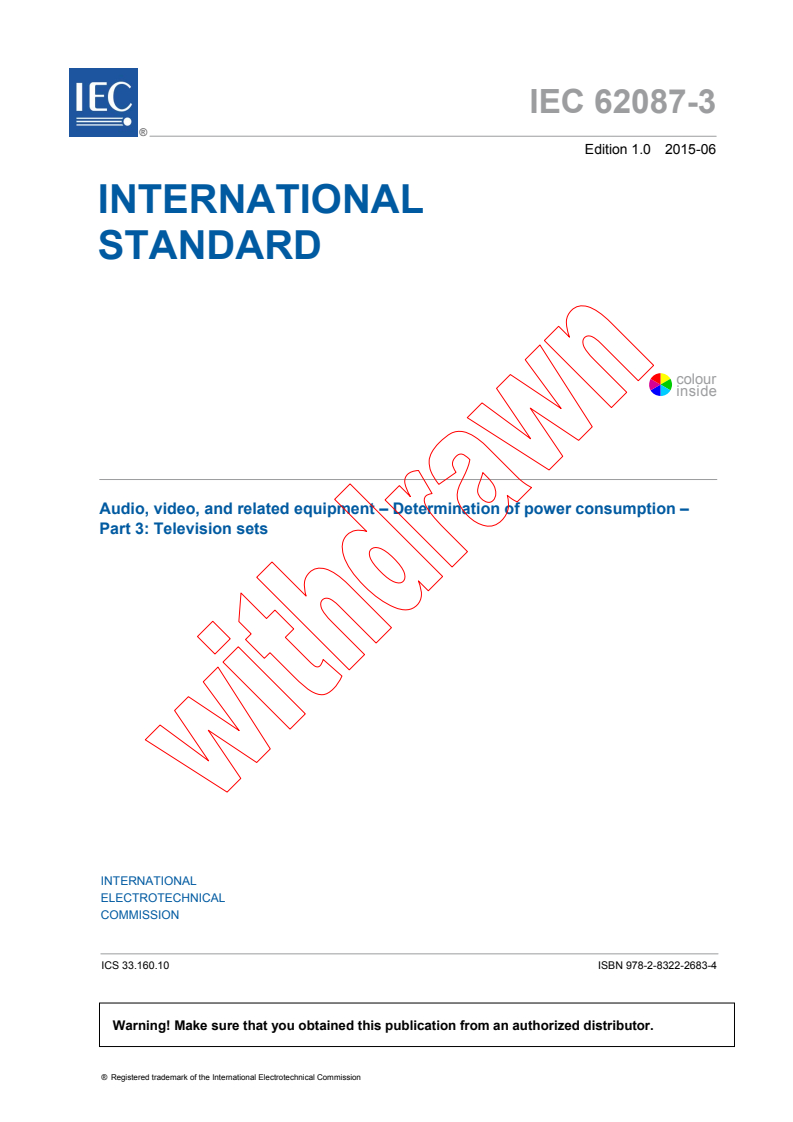 IEC 62087-3:2015 - Audio, video, and related equipment - Determination of power consumption - Part 3: Television sets Released:6/5/2015