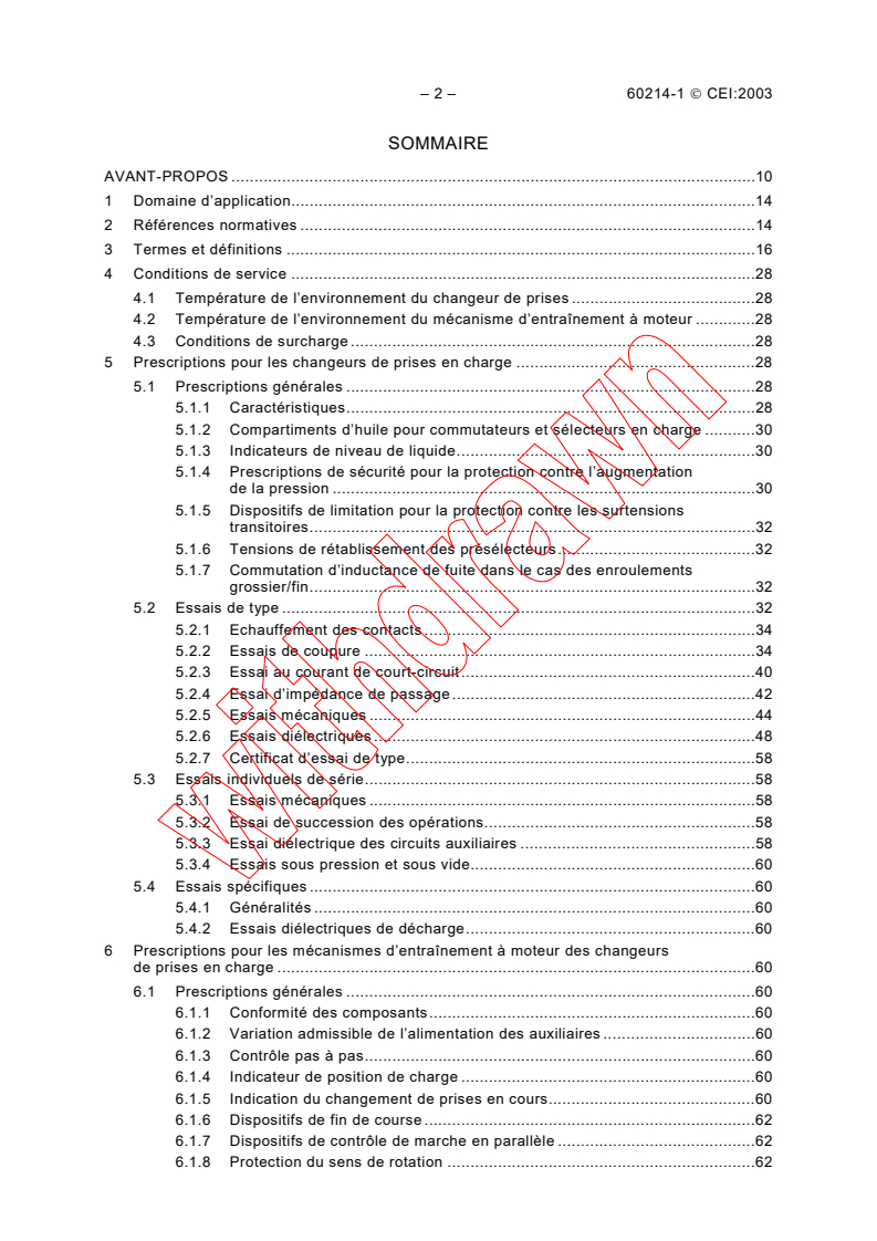 S'applique aux changeurs de prises en charge aussi bien de type à résistance qu'à bobine d'inductance, aux changeurs de prises hors circuit et à leurs mécanismes d'entraînement à moteur. S'applique essentiellement aux changeurs de prises immergés dans de l'huile pour transformateur selon la CEI 60296, mais peut également être utilisée pour des changeurs de prises à isolation gazeuse ou immergés dans d'autres liquides isolants.