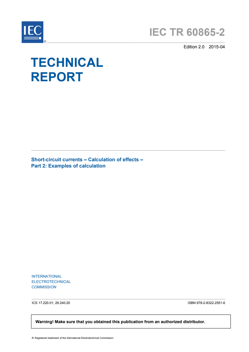 IEC TR 60865-2:2015 - Short-circuit currents: Calculation of effects - Part 2: Examples of calculation - is a Technical Report published by the IEC that provides worked examples illustrating the procedures given in IEC 60865-1 for calculating the mechanical and thermal effects of short-circuit currents. This second edition (2015) replaces the 1994 edition and clarifies application cases without changing the fundamental, standardized calculation basis in IEC 60865-1.