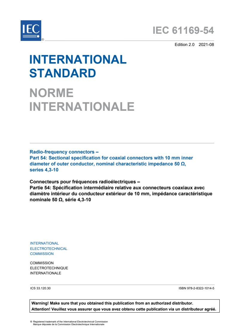 IEC 61169-54:2021 RLV - Radio frequency connectors - Part 54: Sectional specification for coaxial connectors with 10 mm inner diameter of outer conductor, nominal characteristic impedance 50 ?, Series 4,3-10 Released:8/27/2021