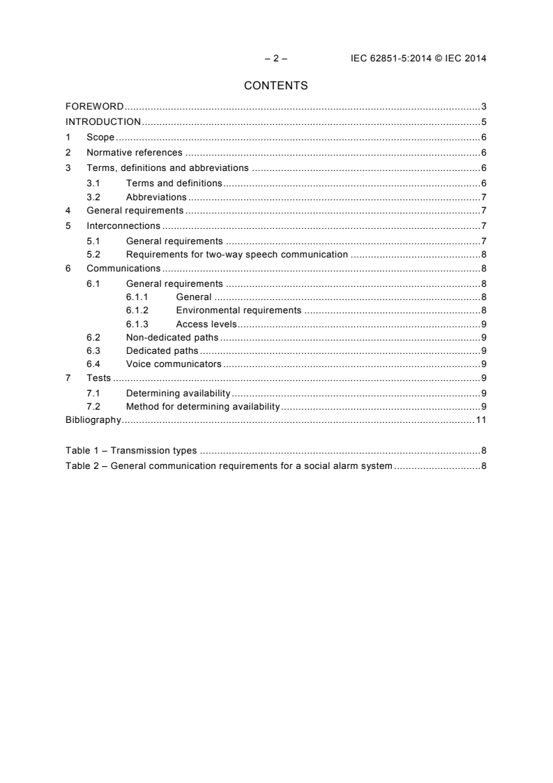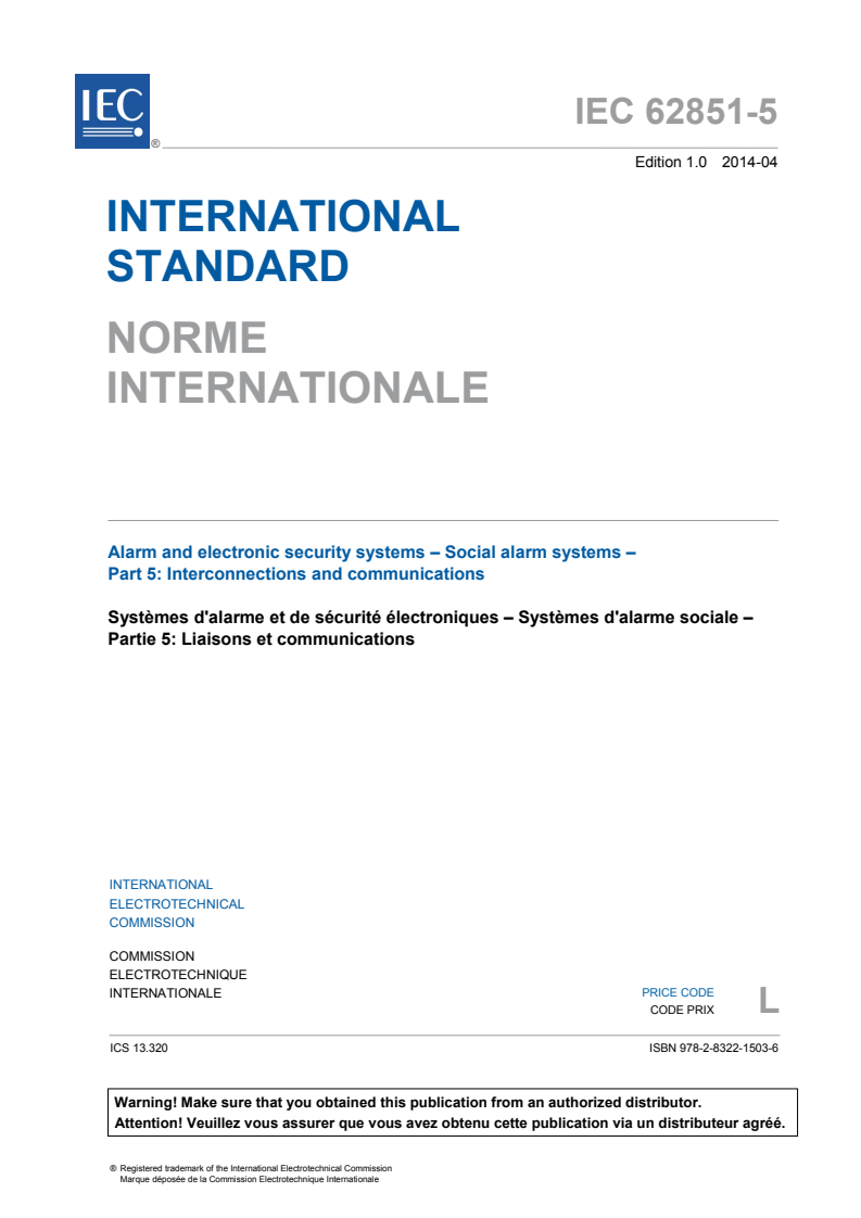 IEC 62851-5:2014 specifies the minimum requirements for the interconnections and communications within a social alarm system.