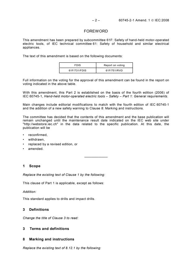 Building upon the general requirements established in IEC 60745-1 (4th edition, 2006), this amendment introduces editorial enhancements and additional safety warnings to ensure the safe design, operation, and endurance of drills and impact drills under various conditions.