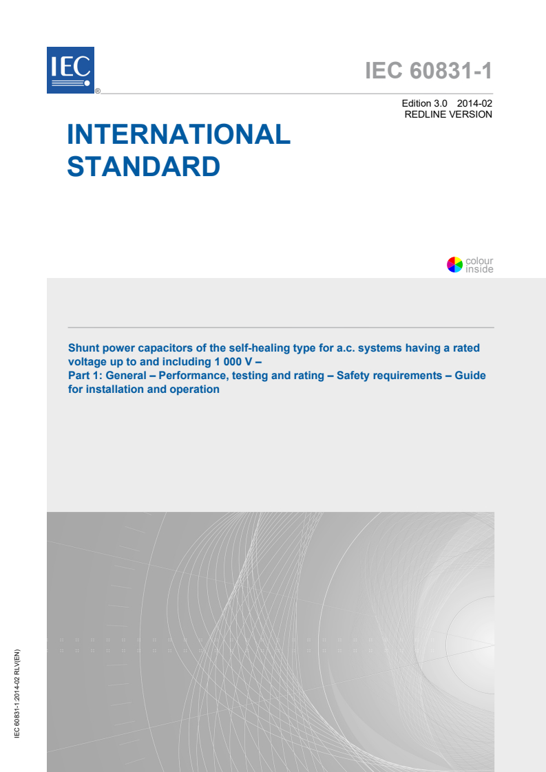 IEC 60831-1:2014 RLV - Shunt power capacitors of the self-healing type for a.c. systems having a rated voltage up to and including 1 000 V - Part 1: General - Performance, testing and rating - Safety requirements - Guide for installation and operation Released:2/11/2014