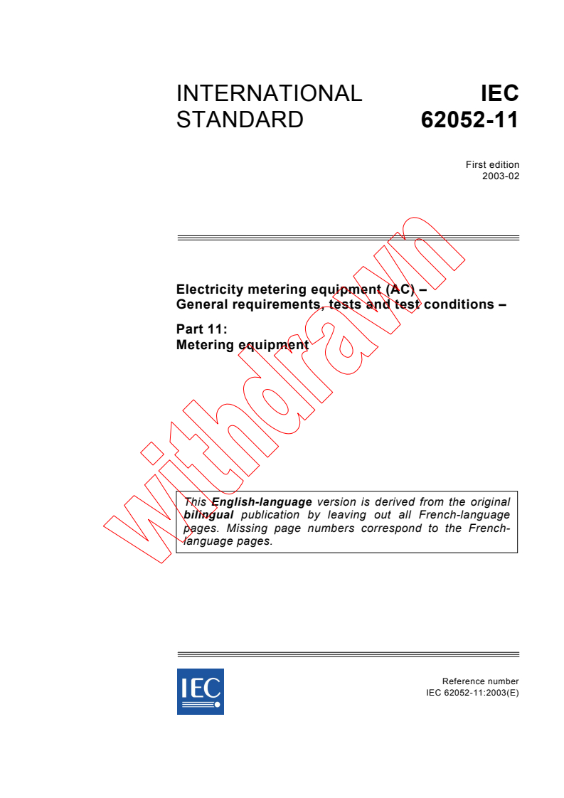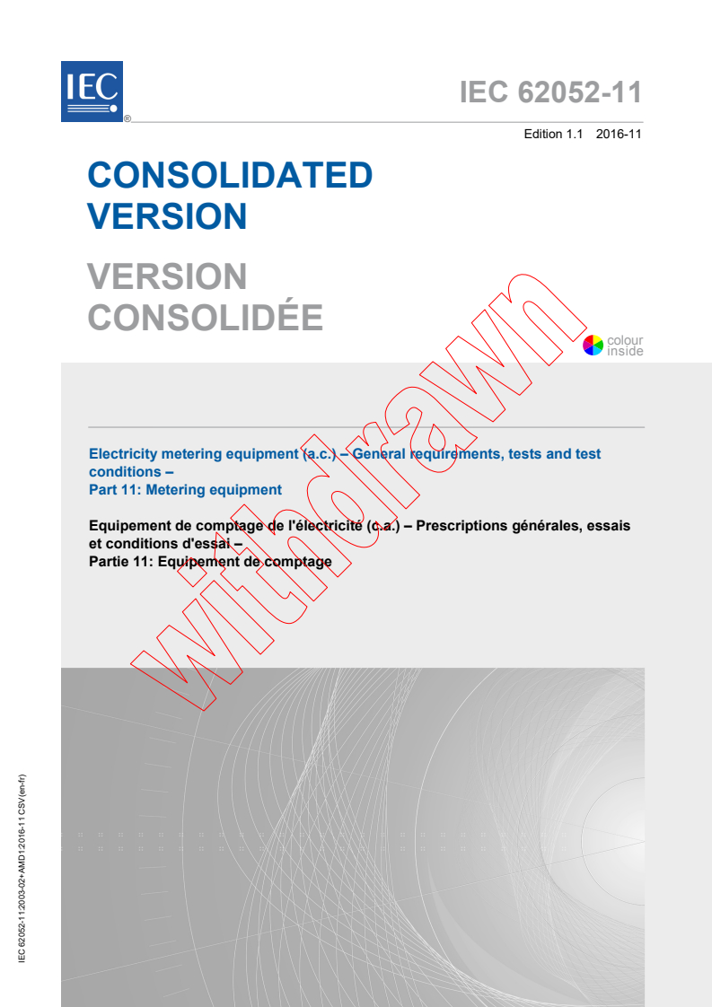 IEC 62052-11:2003 is a standard published by the International Electrotechnical Commission (IEC). Its full title is "Electricity metering equipment (AC) - General requirements, tests and test conditions - Part 11: Metering equipment". This standard covers: Covers type tests for electricity metering equipment for indoor and outdoor application and to newly manufactured equipment designed to measure the electric energy on 50 Hz or 60 Hz networks, with a voltage up to 600 V. It applies to electromechanical or static meters for indoor and outdoor application consisting of a measuring element and register(s) enclosed together in a meter case. It also applies to operation indicator(s) and test output(s). This publication is of high relevance for Smart Grid.