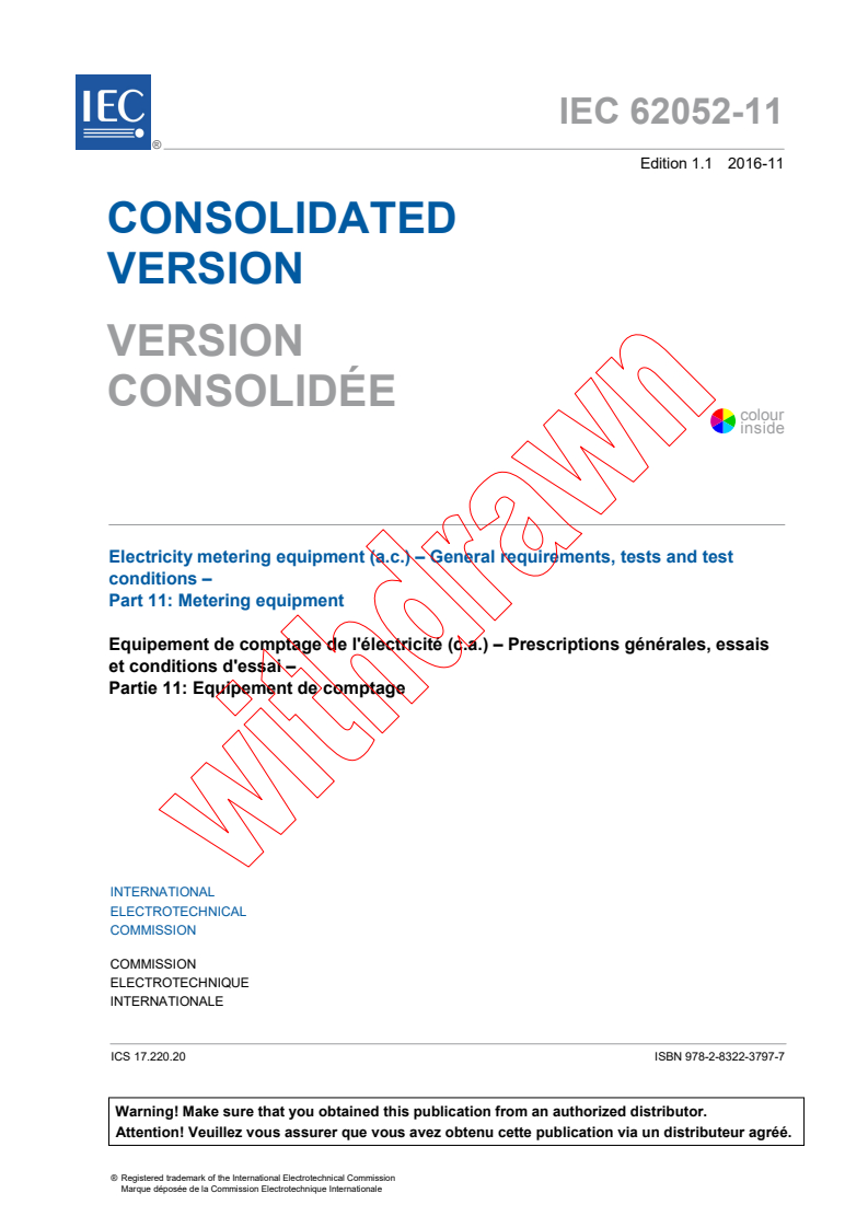 IEC 62052-11:2003+AMD1:2016 CSV - Electricity metering equipment (a.c.) - General requirements, tests and test conditions - Part 11: Metering equipment Released:11/22/2016