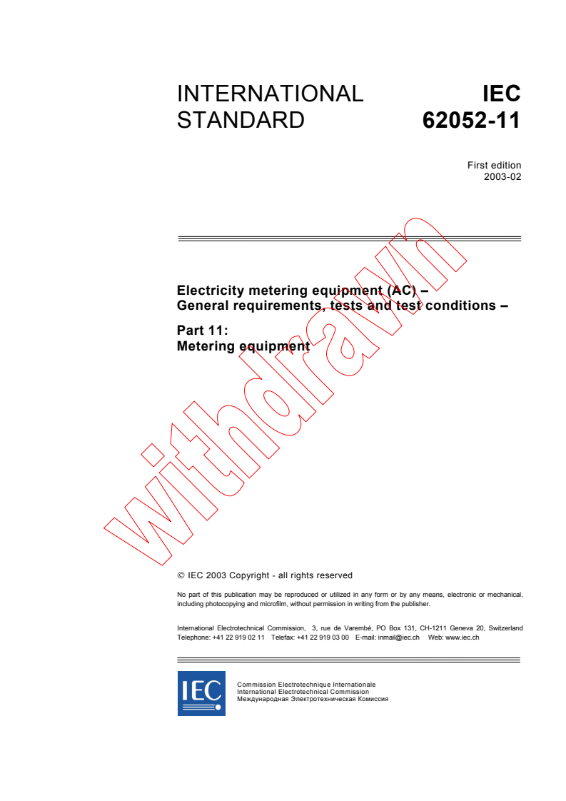IEC 62052-11:2003 - Electricity metering equipment (AC) - General requirements, tests and test conditions - Part 11: Metering equipment Released:2/12/2003