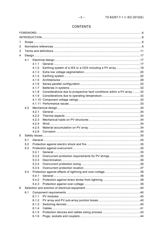 IEC/TS 62257-7-1:2010(E) specifies the general requirements for the design and the safety of generators used in decentralized rural electrification systems. Provides requirements for ELV and LV PV arrays. Particular attention must be paid to voltage level, as this is important for safety reasons and has an influence on protective measures and on the skill and ability level of operators. The main technical changes with regard to the previous edition are the following:
