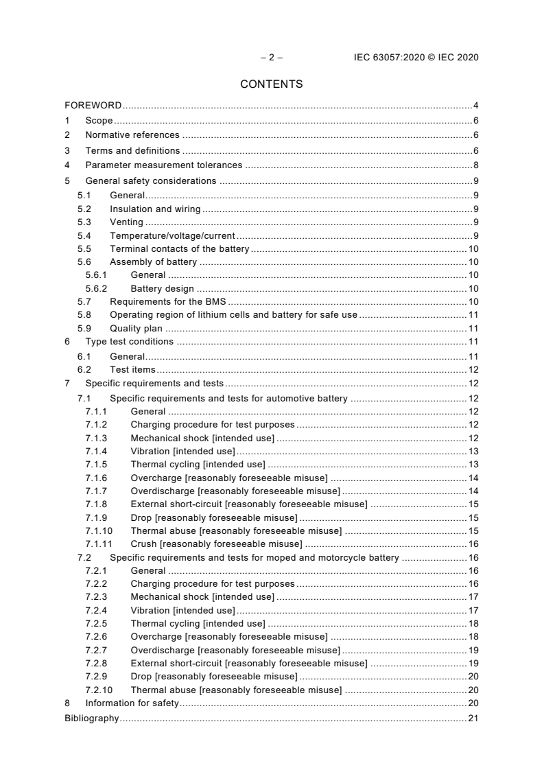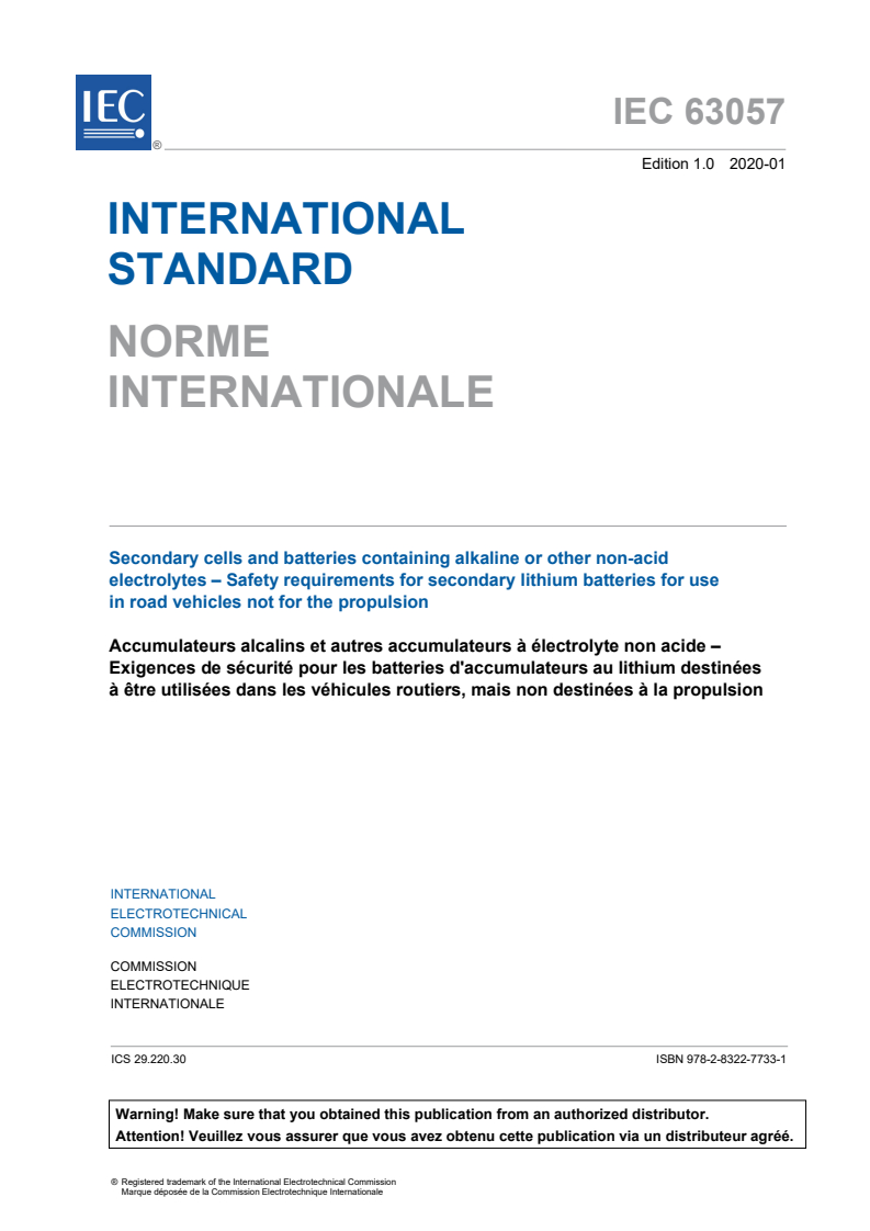 IEC 63057:2020 specifies safety tests and requirements for secondary lithium batteries permanently installed in road vehicles not for the propulsion. Replacement secondary batteries permanently installed in road vehicles not for propulsion are covered by this document.
