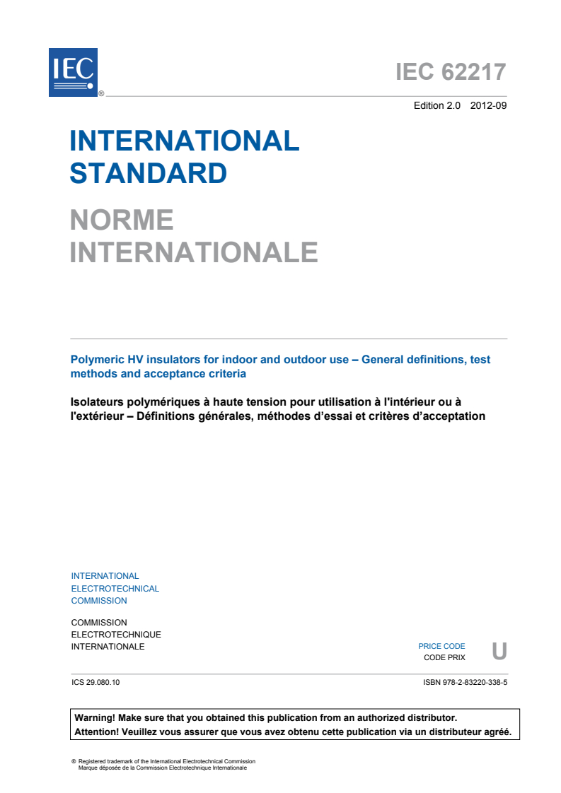 IEC 62217:2012 is a standard published by the International Electrotechnical Commission (IEC). Its full title is "Polymeric HV insulators for indoor and outdoor use - General definitions, test methods and acceptance criteria". This standard covers: IEC 62217:2012 is applicable to polymeric insulators whose insulating body consists of one or various organic materials. Polymeric insulators covered by this standard include both solid core and hollow insulators. They are intended for use on HV overhead lines and in indoor and outdoor equipment. The object of this standard is: - to define the common terms used for polymeric insulators; - to prescribe common test methods for design tests on polymeric insulators; - to prescribe acceptance or failure criteria, if applicable. These tests, criteria and recommendations are intended to ensure a satisfactory life-time under normal operating and environmental conditions. This standard shall only be applied in conjunction with the relevant product standard. This second edition cancels and replaces the first edition published in 2005. This edition constitutes a technical revision. This edition includes a significant technical change with respect to the previous edition. The first edition of IEC 62217 (2005) included two other alternative tracking and erosion tests (a 5 000 hour multi-stress test and a tracking wheel test) which were based on tests developed by CIGRE and utilities. These tests are no longer given as normative alternatives following the results of a study/questionnaire by TC 36 on the relative merits of all three tracking and erosion tests. The 5 000 hour multi-stress test and a tracking wheel test are described in IEC/TR 62730 (2012).