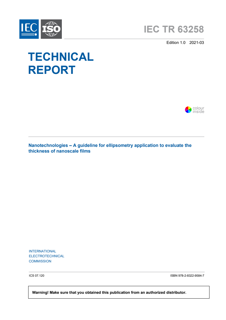 Keywords: IEC TR 63258:2021, ellipsometry, nanoscale films, thickness measurement, data reproducibility, dispersion models, optical constants, measurement protocol.