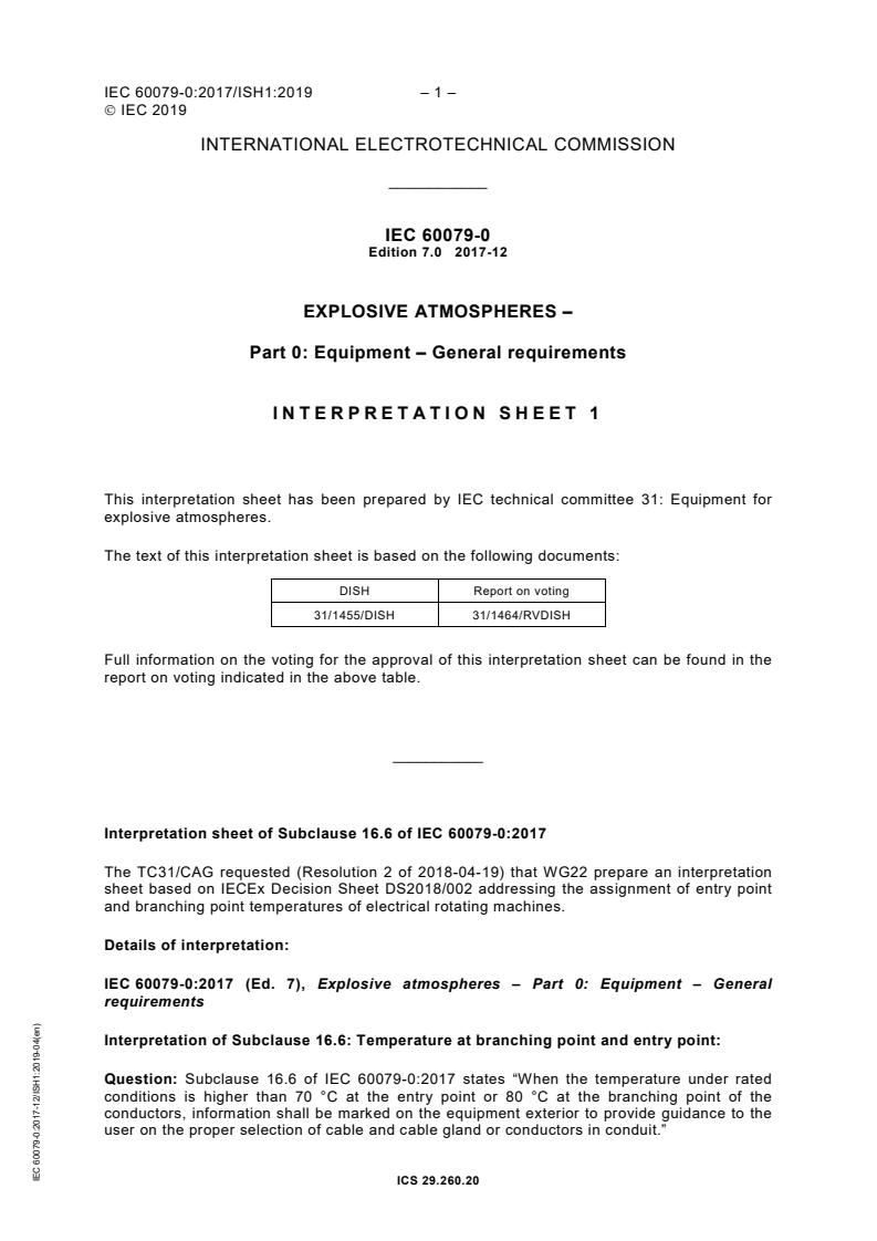 – 4 – IEC 60079-0:2017 IEC 2017 17.2 Ventilation. 60 17.2.1 Ventilation openings . 60 17.2.2 Materials for external fans . 60 17.2.3 Cooling fans of rotating electric machines . 60 17.2.4 Auxiliary motor cooling fans . 61 17.2.5 Room ventilating fans . 61 17.3 Bearings . 62 18 Supplementary requirements for switchgear . 62 18.1 Flammable dielectric . 62 18.2 Disconnectors . 62 18.3 Group I – Provisions for locking . 63 18.4 Doors and covers . 63 19 Reserved for future use . 63 20 Supplementary requirements for external plugs, socket outlets and connectors for field wiring connection . 63 20.1 General . 63 20.2 Explosive gas atmospheres . 64 20.3 Explosive dust atmospheres . 64 20.4 Energized plugs . 64 21 Supplementary requirements for luminaires . 64 21.1 General . 64 21.2 Covers for luminaires of EPL Mb, EPL Gb, or EPL Db . 64 21.3 Covers for luminaires of EPL Gc or EPL Dc . 65 21.4 Sodium lamps . 65 22 Supplementary requirements for caplights and handlights . 65 22.1 Group I caplights . 65 22.2 Group II and Group III caplights and handlights