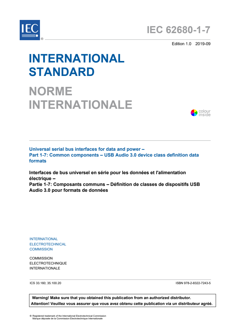 IEC 62680-1-7:2019 is a standard published by the International Electrotechnical Commission (IEC). Its full title is "Universal serial bus interfaces for data and power - Part 1-7: Common components - USB Audio 3.0 device class definition data formats". This standard covers: IEC 62680-1-7:2019 describes in detail all the Audio Data Formats that are supported by the Audio Device Class. This document is considered an integral part of the Audio Device Class Specification, although subsequent revisions of this document are independent of the revision evolution of the main USB Audio Specification. This is to easily accommodate the addition of new Audio Data Formats without impeding the core USB Audio Specification.