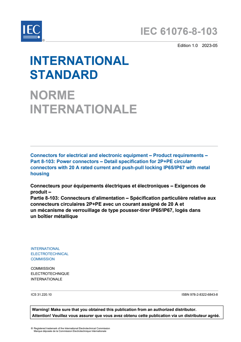 IEC 61076-8-103:2023 - Connectors for electrical and electronic equipment - Product requirements - Part 8-103: Power connectors – Detail specification for 2P+PE circular connectors with 20 A rated current and push-pull locking IP65/IP67 with metal housing Released:5/3/2023
